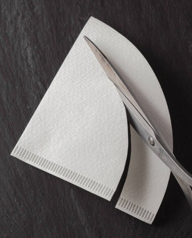 ペーパードリップは、一番小さなものでも杯数に余裕を持って作られています。淹れるのが1杯であれば、ペーパーの濾過に役立たない余る部分があります。ただ余るならいいのですが、自分には初期段階の旨みあるエキスを吸い取っていやがるようにしか見えません。だったら最初から、いらない部分は切り捨てておこう、という意味です。