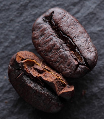 2ハゼが始まって即冷却。左の写真は同じ焼き上がりのはずのシティのWIB-1を隣に並べた比較です。見た目はフレンチローストだけど、豆の中身はシティですから、何とも奇妙な仕上がりです。割ってみると色はシティで、一応中まで火は通っているようでした。シワもそこそこ伸びています。使った生豆は水洗式ながら、味醂がよく染み込んだのかセンターカットは色づいてナチュラルっぽいです。